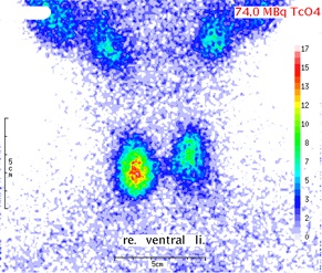 Die Schilddrüsenszintigraphie mit MIBI ist eine komplementäre Untersuchung zur konventionellen Tc-Szintigraphie (Funktionsszintigraphie).