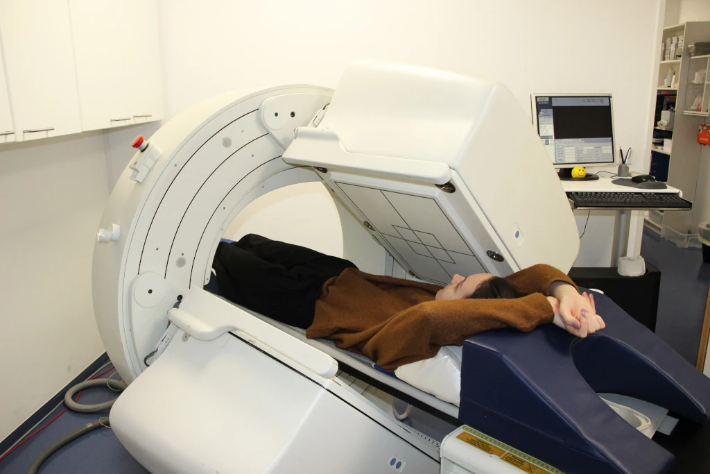 Mit szintigraphischen Aufnahmen werden die Anreicherungen mittels einer Gammakamera bildlich dargestellt. Teils werden Frühaufnahmen gleich nach Injektion, teils auch erneut nach 1 Std. erstellt, und das Sternum markiert.